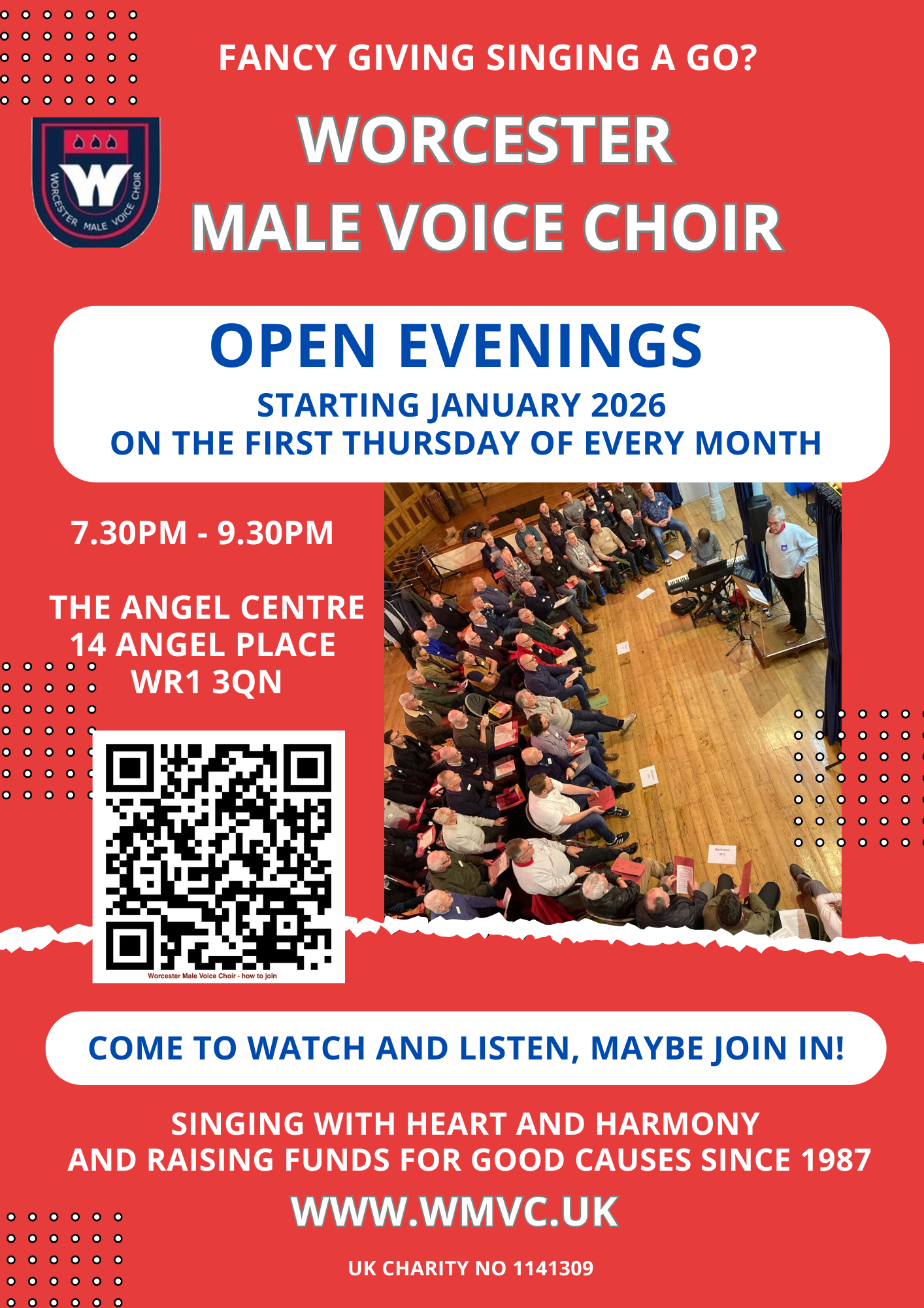 We meet to practice and rehearse on most MONDAYS and THURSDAYS at 7:15pm at The Angel Centre, Angel Place, Worcester WR1 3QN